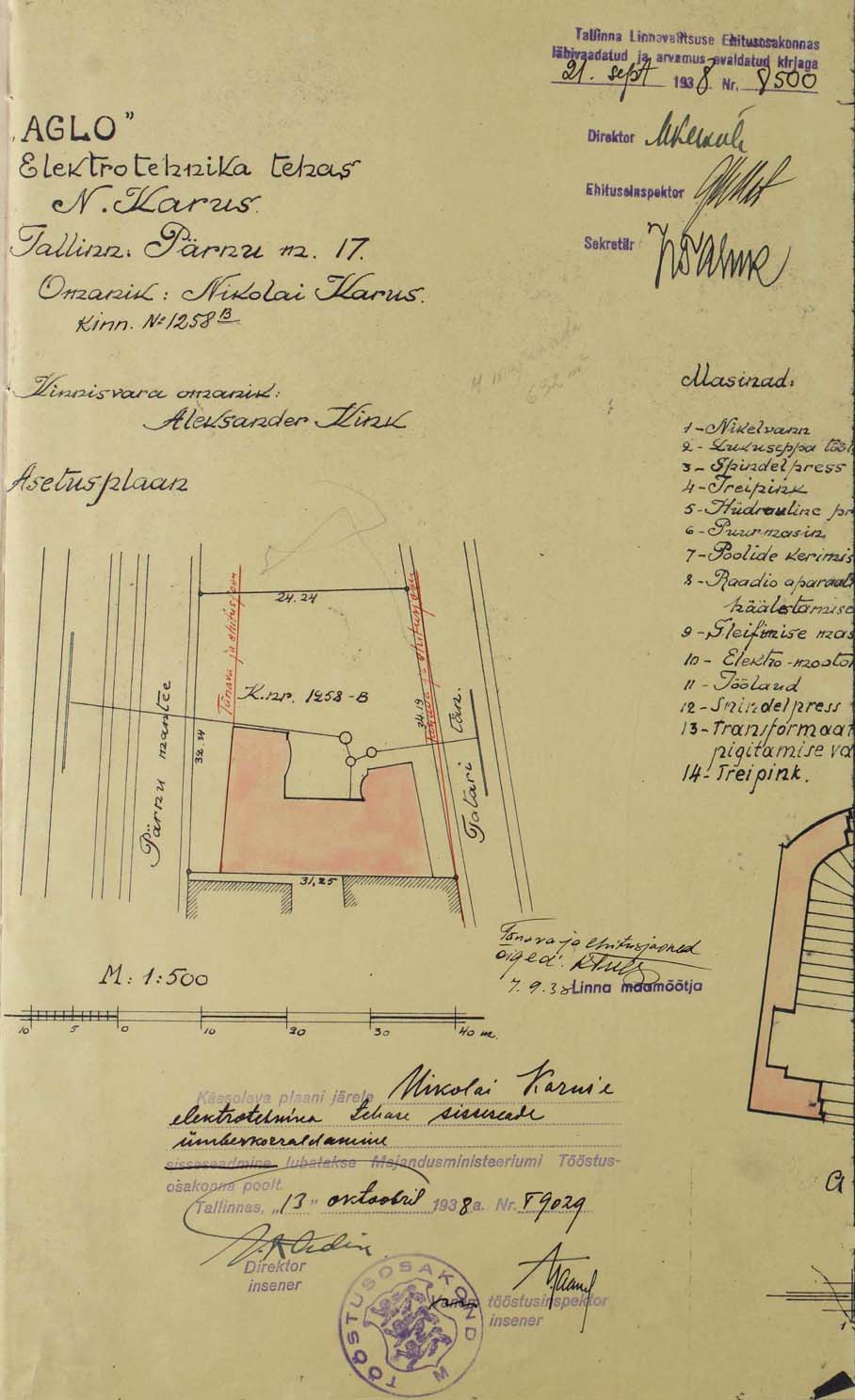 Aglo tööstuse ruumide plaan 1938. a-st, Tallinn, Pärnu mnt 17 kolmas korrus /Riigiarhiiv ERA.969.4.1027/; Aglo asukoht
