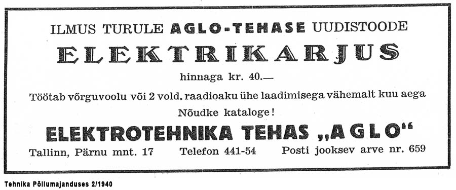 Aglo patenteeritud tuulegeneraatori abil.". 1940. aastal mainitakse elektrikarjuse reklaamis ka selle toote kataloogi. On teada