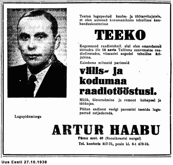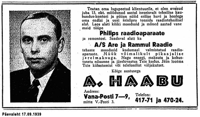 10-7 oma raadio-, foto- ja tehniliste kaupade äri täisühingu Artur & Elsa Haabu ning selle asemel 1939. aastal äri Artur Haabu.