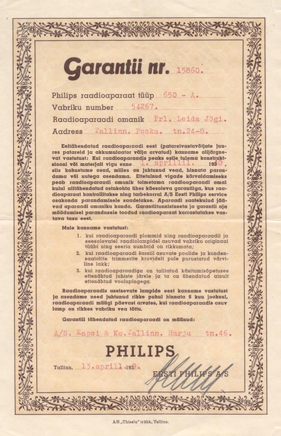 *AS Kapsi & Ko 1939. a. kevadel raadioaparaadile Philips 650A välja antud garantiitunnistus /erakogu/.
