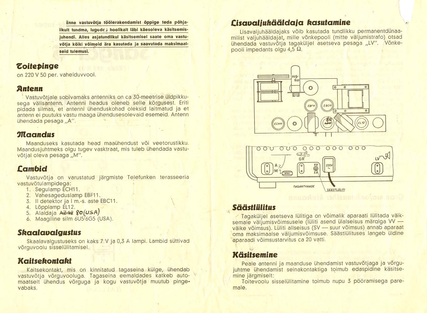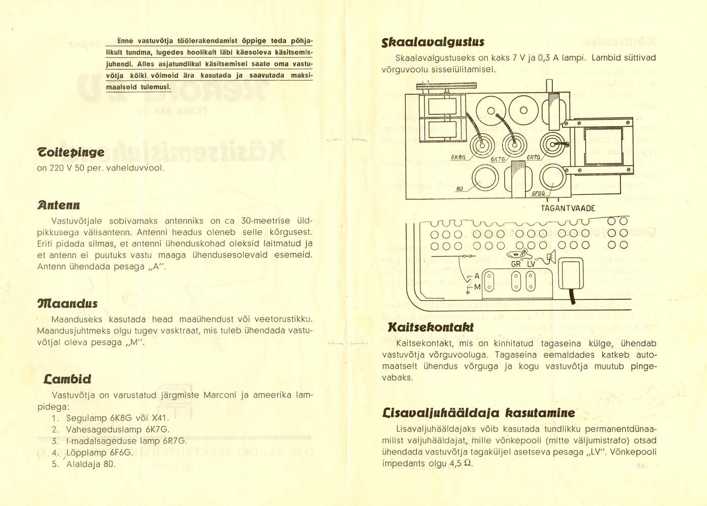 Lambid: 4+1 (Marconi ja ameerika 6K8G või X41, 6K7G, 6R7G, 6F6G, 80)