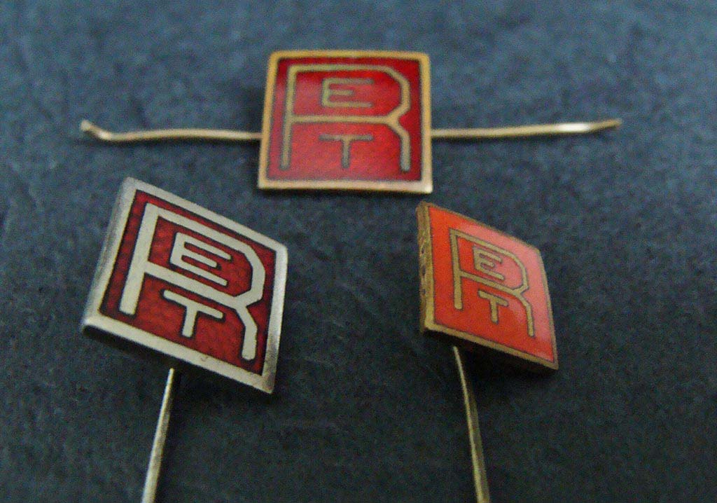 Vasakul Punase-RETi tehasemärgid. Paremal Punase-RETi suveniirmärgid, mida jagati näiteks näitustel, koostööpartneritele, külalistele.