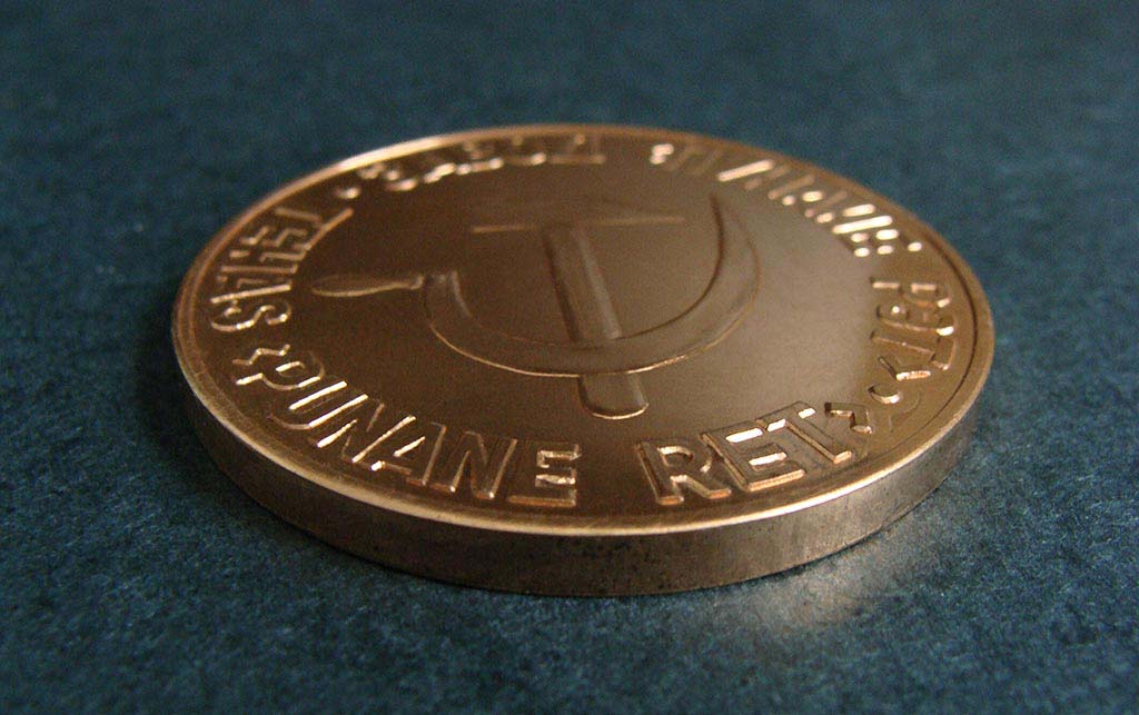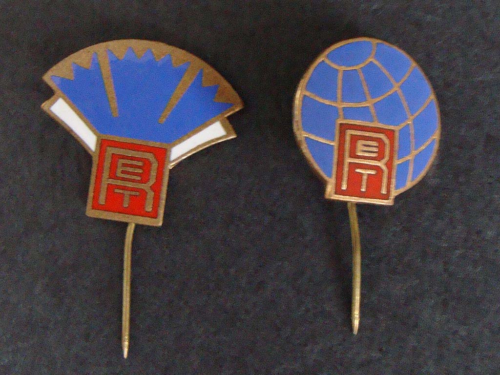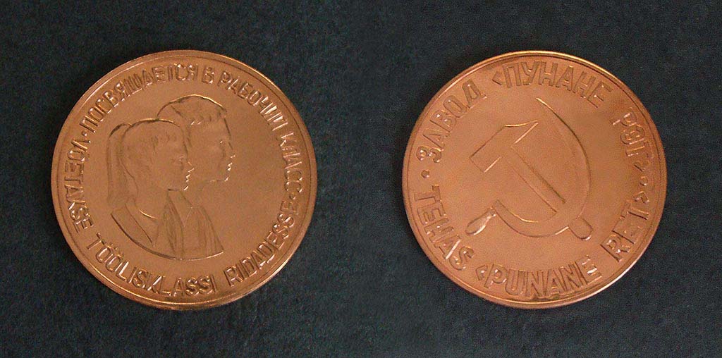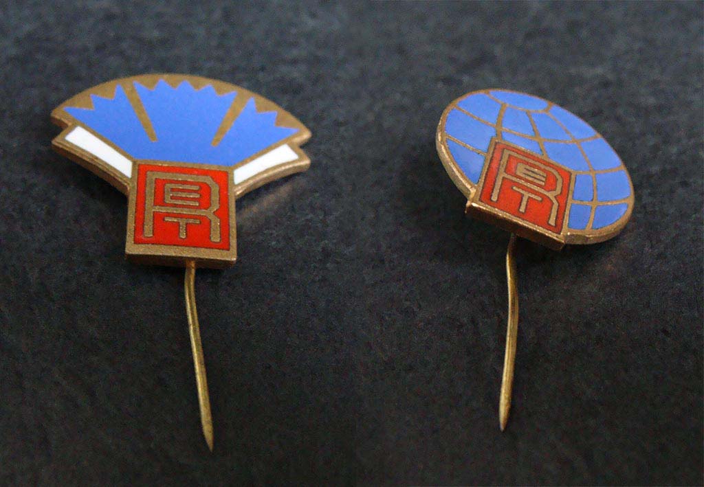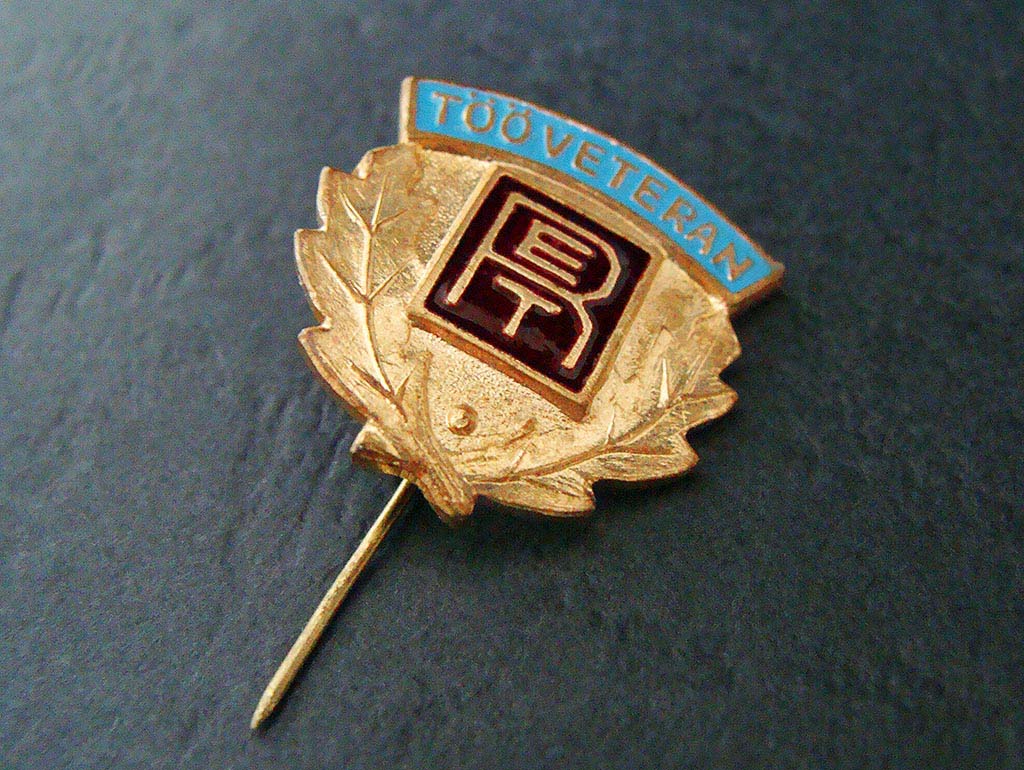 Vasakul Punase-RETi tööveterani märk. Paremal Punase-RETi mälestusmedal "Võetakse töölisklassi ridadesse", mida anti noortele töötajatele.