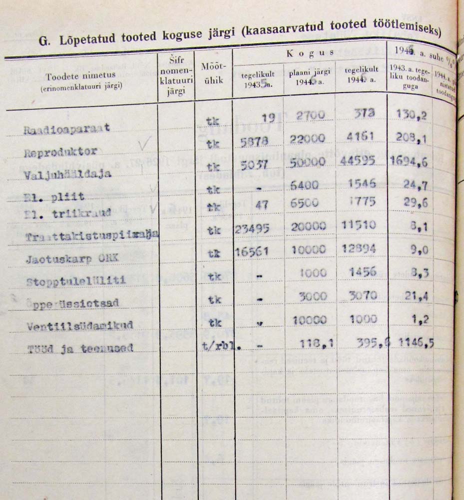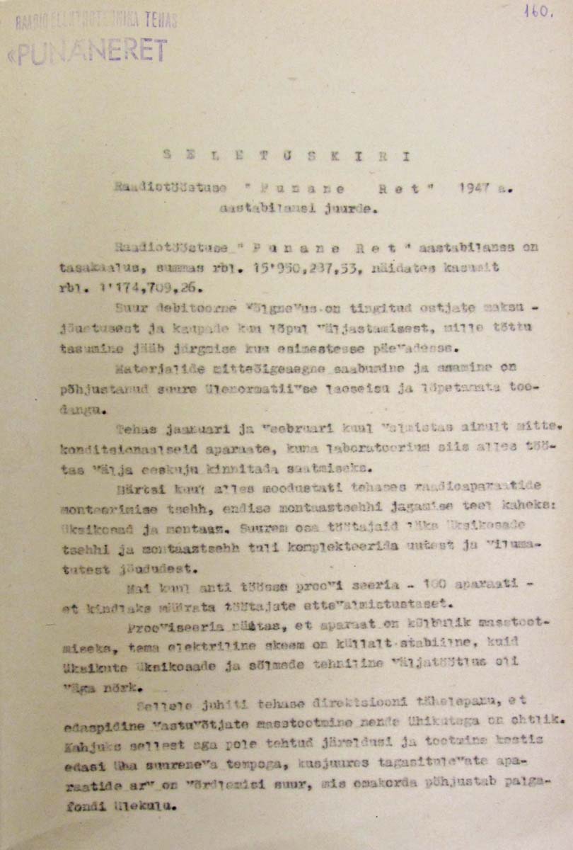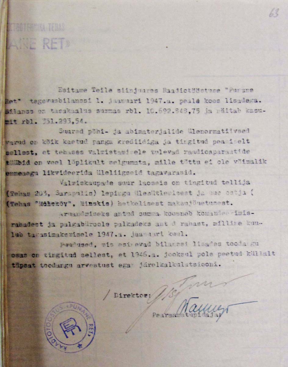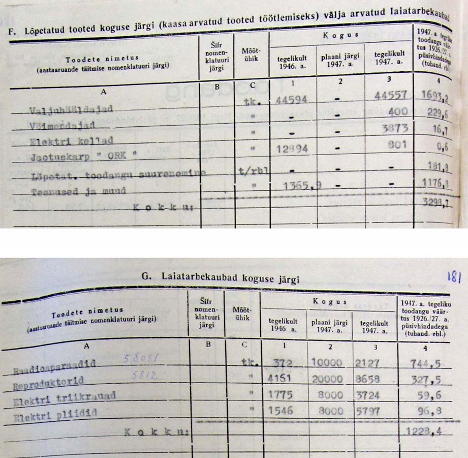 Mõned leheküljed raadiotehase Punane Ret aastaaruannetest 1946 ja 1947: