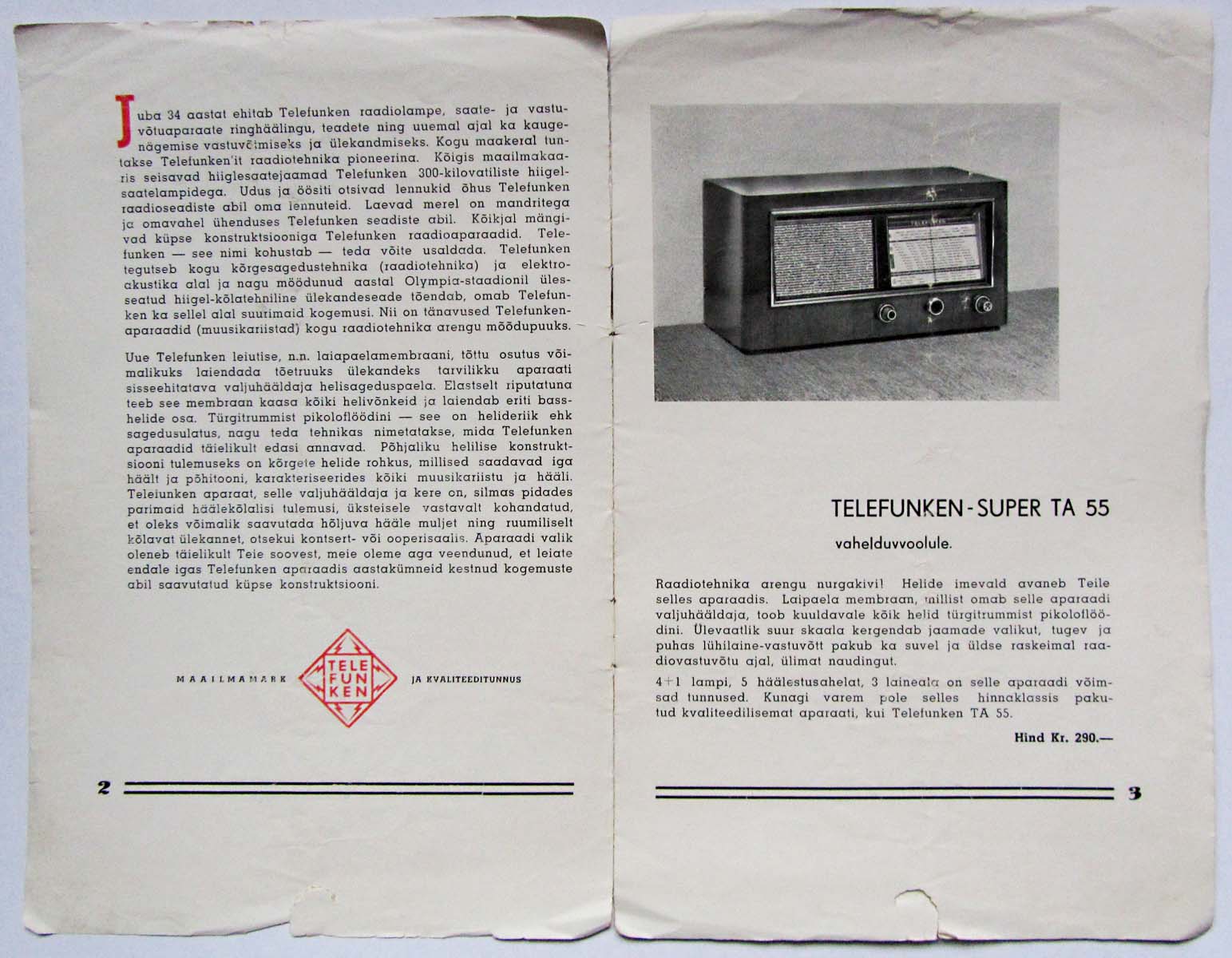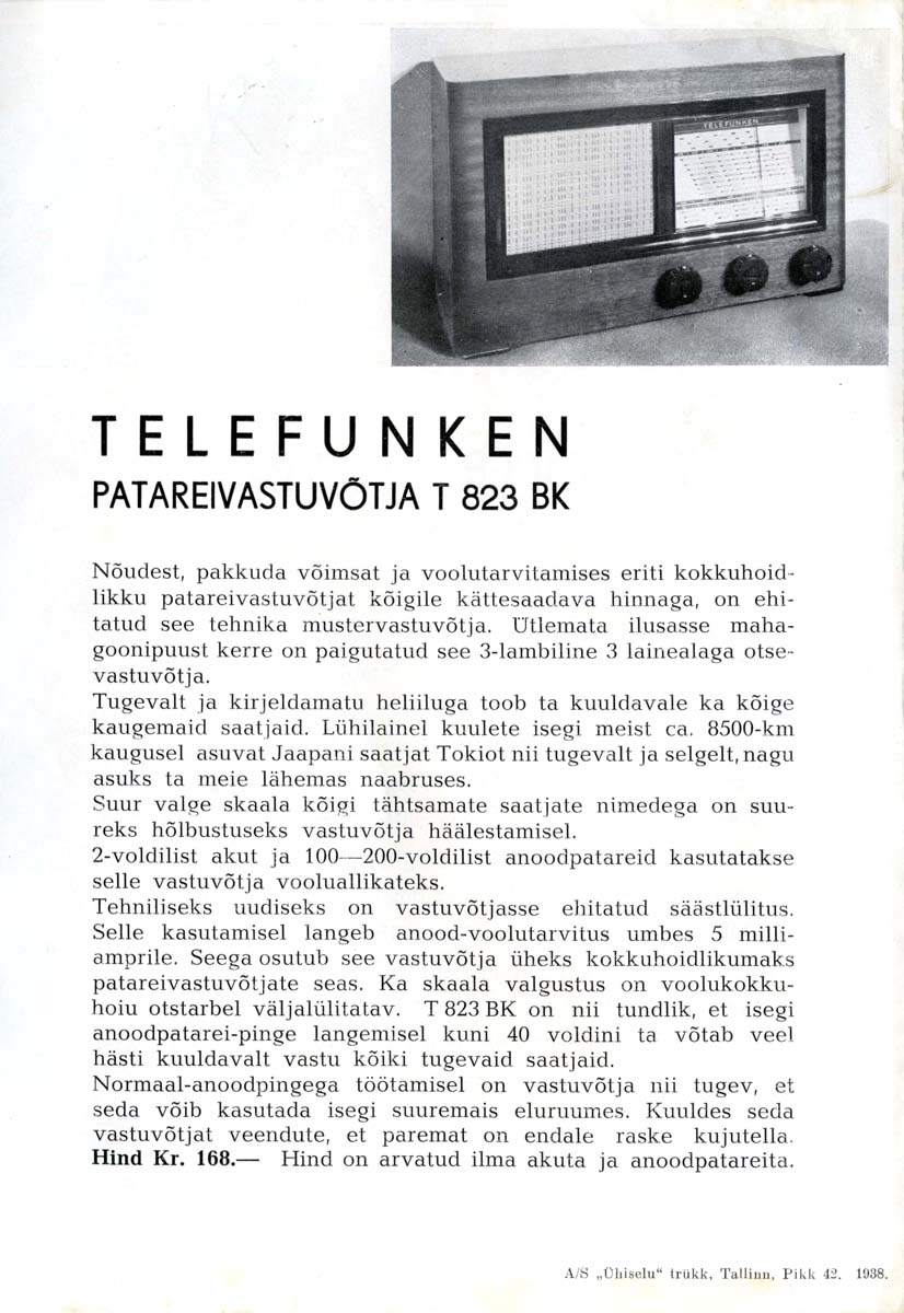 Telefunkeni mudelite T 823 BK ja T 865 BK eestikeelne reklaamtrükis 1938. aastast ja