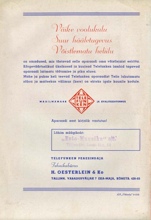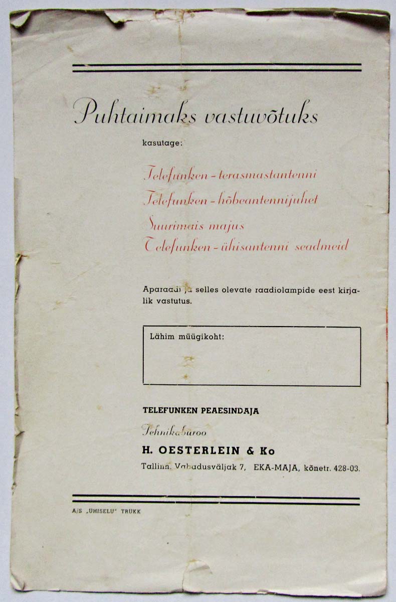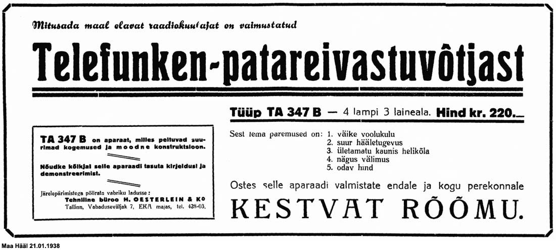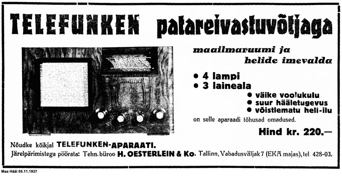 raadioaparaatidele kõrgema tollimaksu. See sundis Telefunkeni Eesti esindajat firmat H. Oesterlein & Ko astuma samme