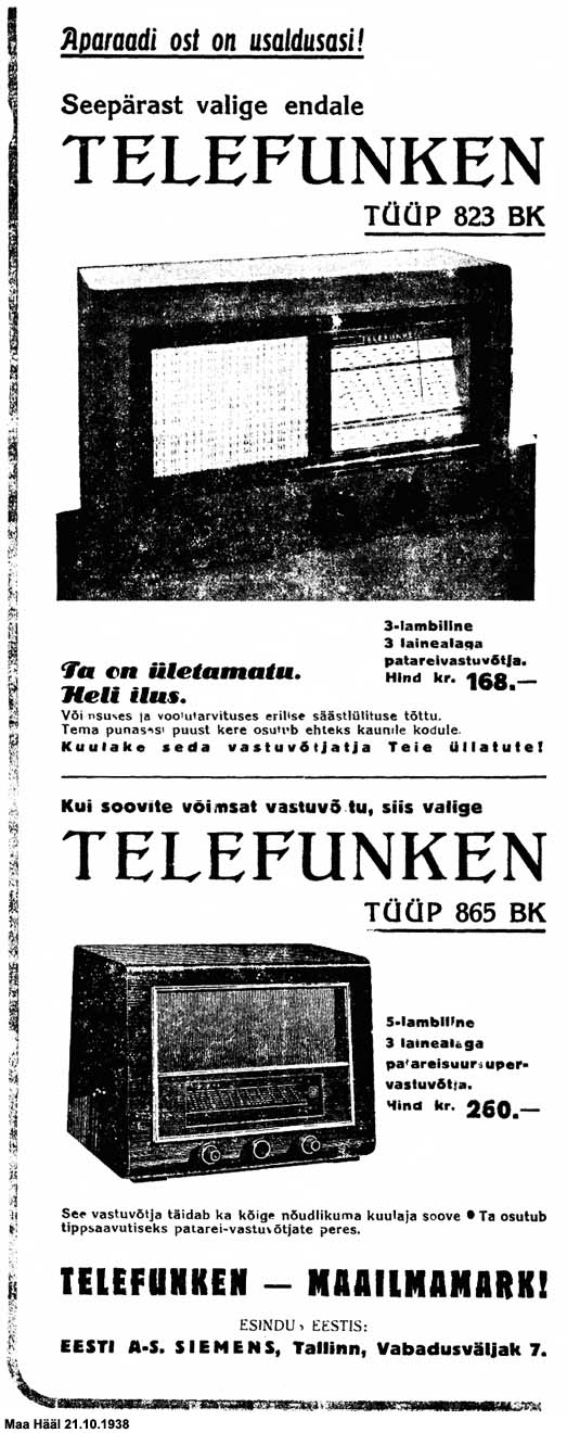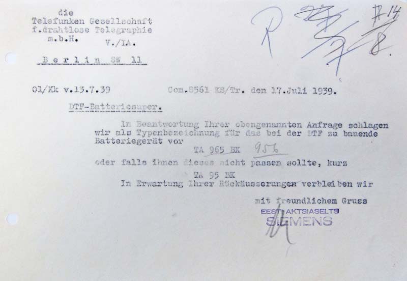 Ka hooajal 1939/40 tellis Eesti AS Siemens Tartu Telefonivabrikult ühe Telefunkeni patareimudeli. Näib, et algusest