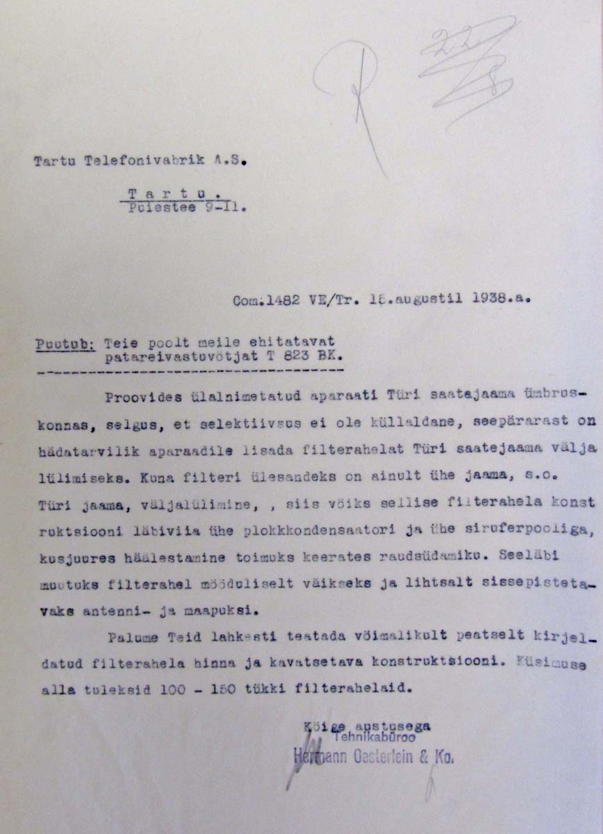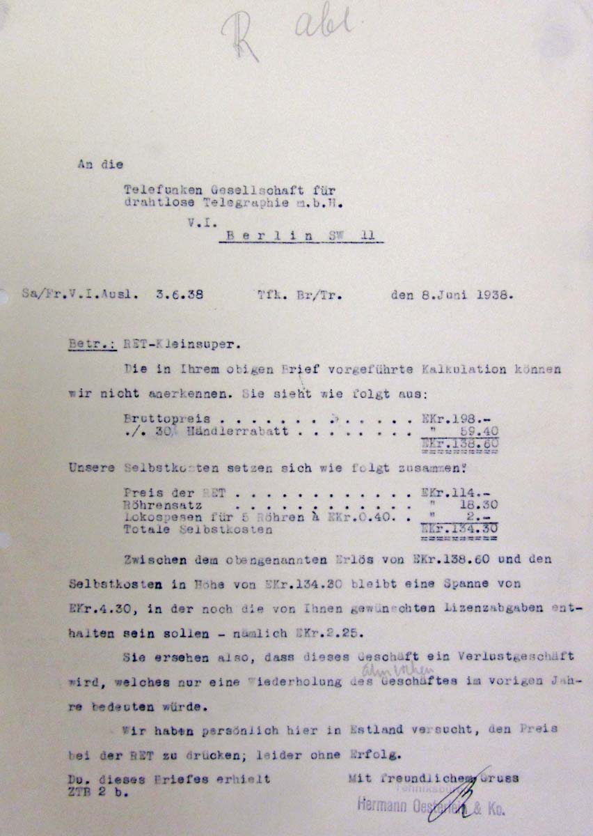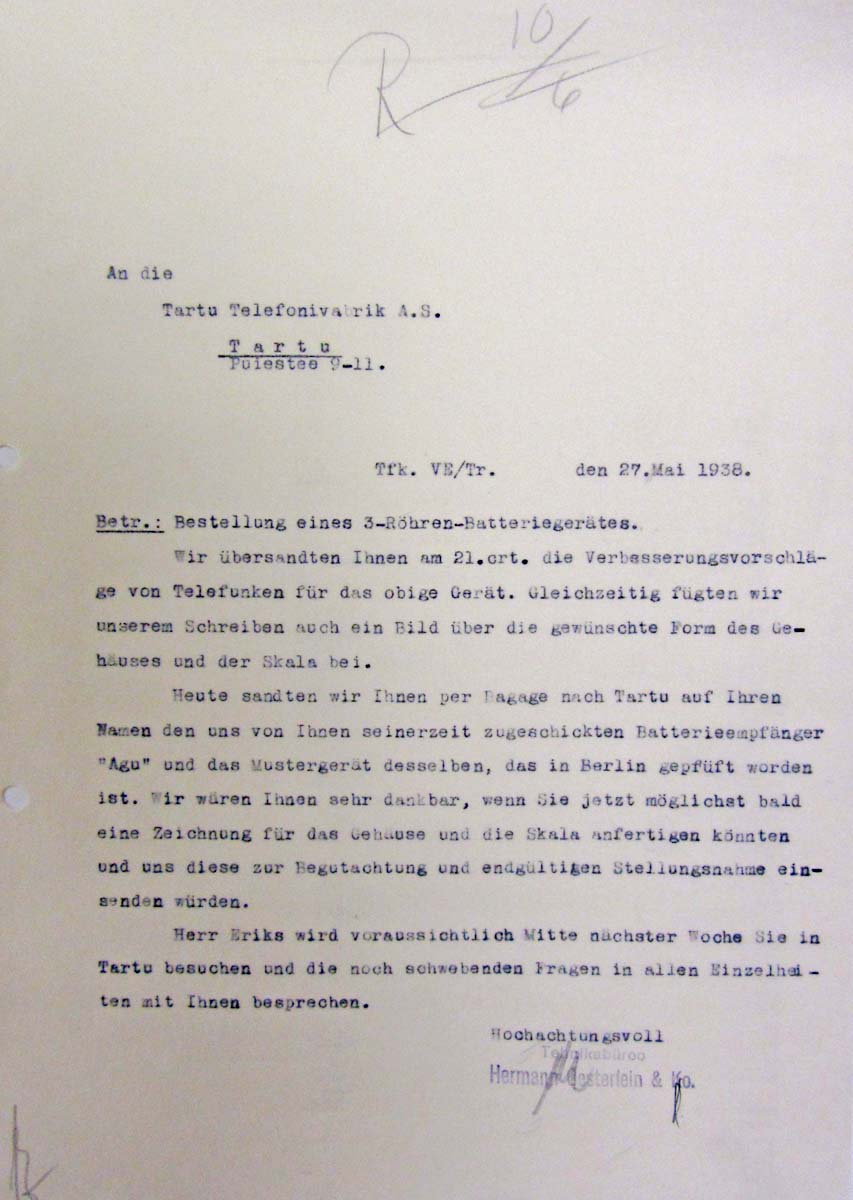 13. jaanuaril 1937 H. Oesterlein & Ko poolt Berliini Telefunkenile saadetud kirjas märgitakse just RETile ettepaneku
