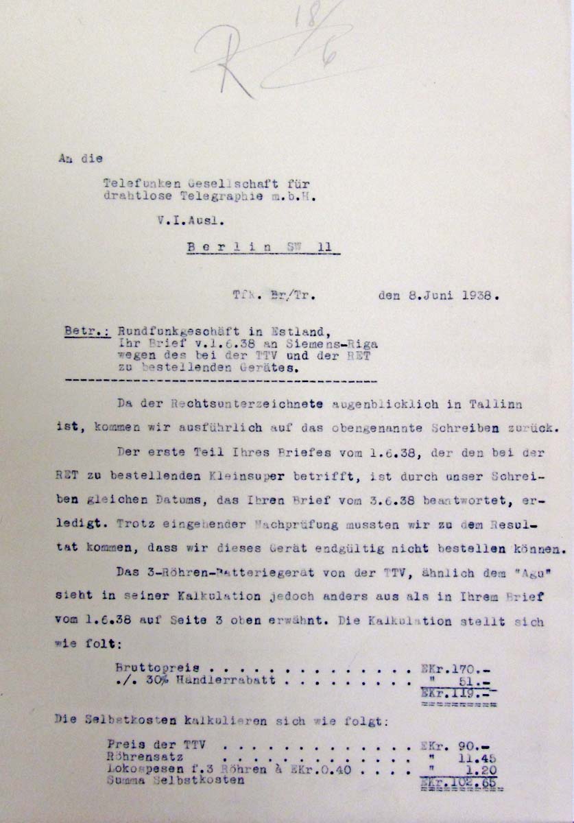 RETi juhatus otsustas Telefunkenile aparaatide valmistamise aprillis 1937: "26.04.1937. Otsustatakse nõustuda, et tehas