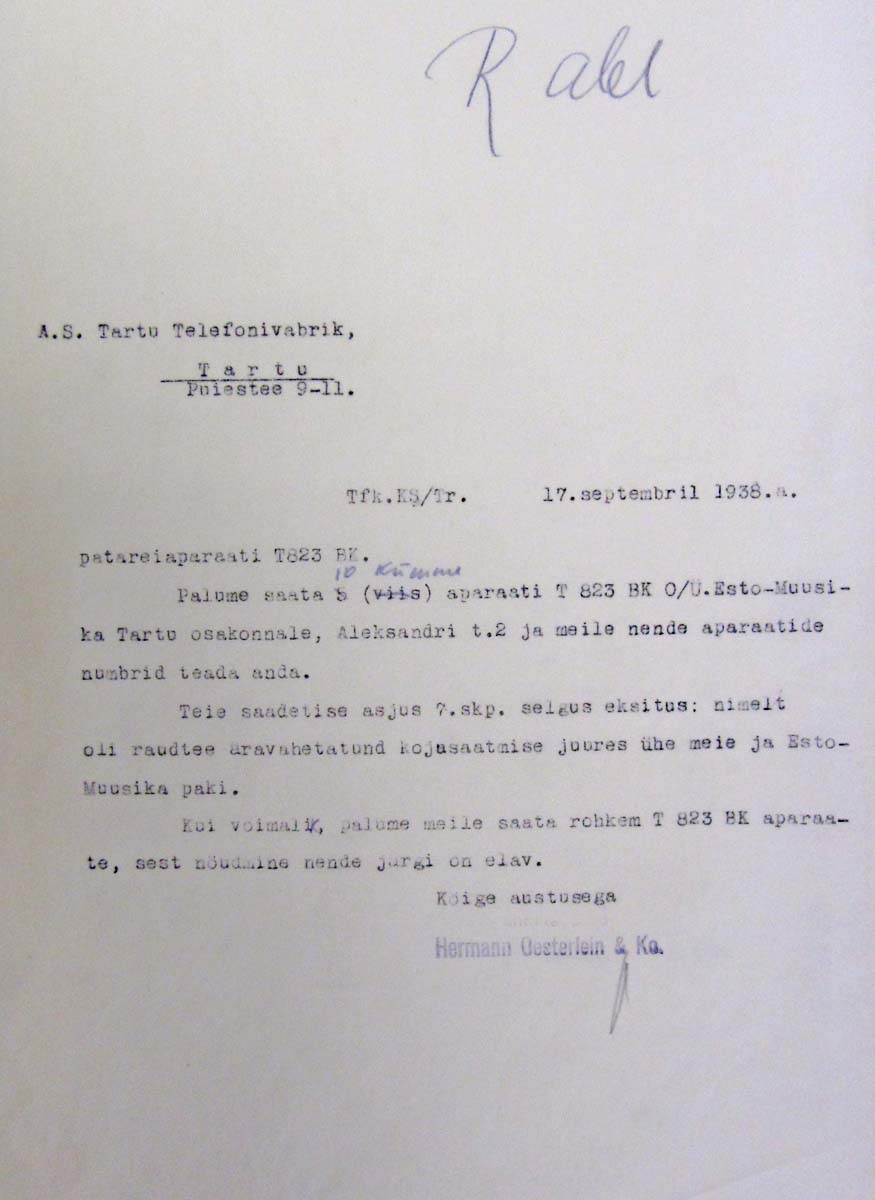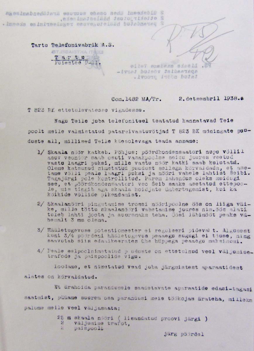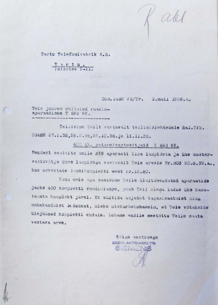 2.12.1938 /ERA.327.1.224, ERA.327.1.225, ERA.327.1.227/; Eesti AS Siemensi 9.05.1939 Tartu Telefonivabrikule saadetud kiri