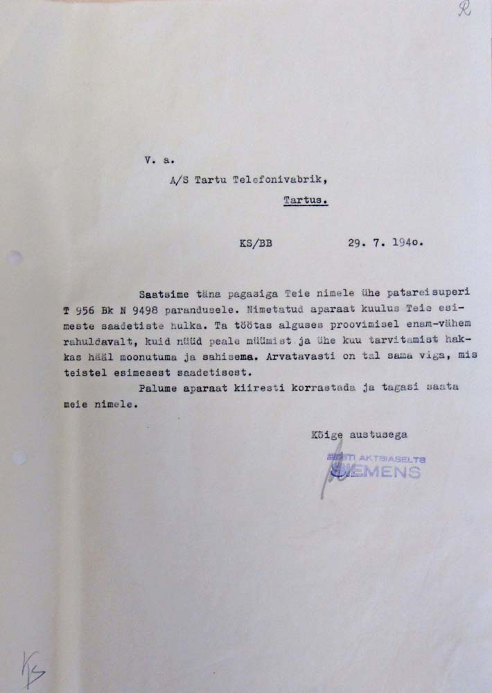 Eesti AS Siemensi 13.07.1939 Tartu Telefonivabrikule saadetud kiri 100 patareiaparaadi 956 BK tellimise asjus (sks k) ja