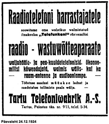 *AS Tartu Telefonivabriku reklaam /Agu 24/1924, Eesti Rahvusraamatukogu digitaalne arhiiv (digar.nlib.ee)/;
