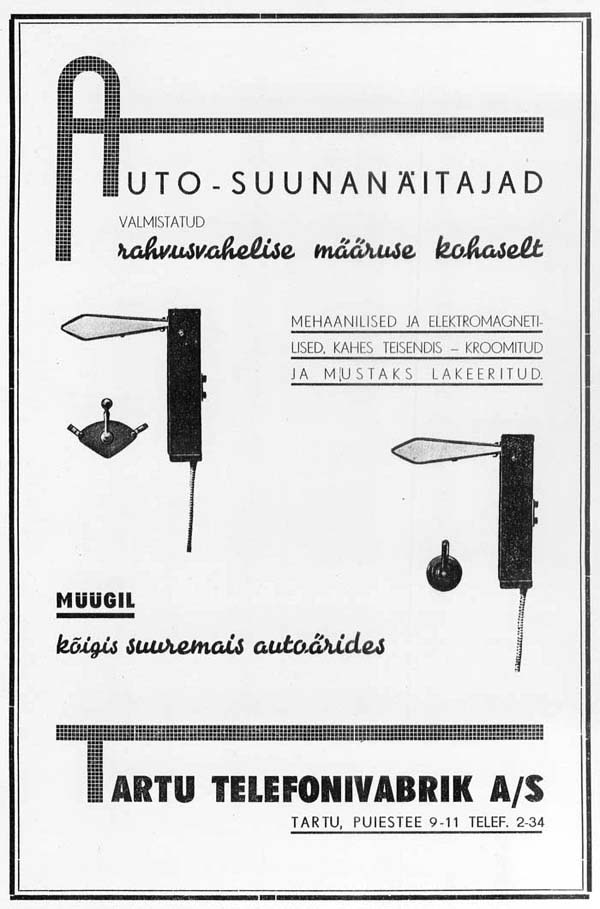 *AS Tartu Telefonivabrikus valmistatud auto suunatulede reklaam 1937. a-st;