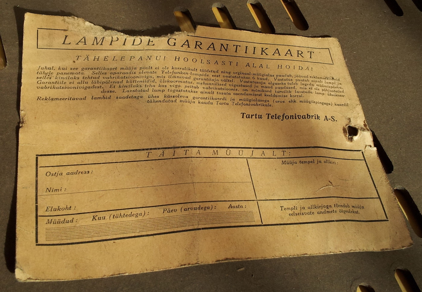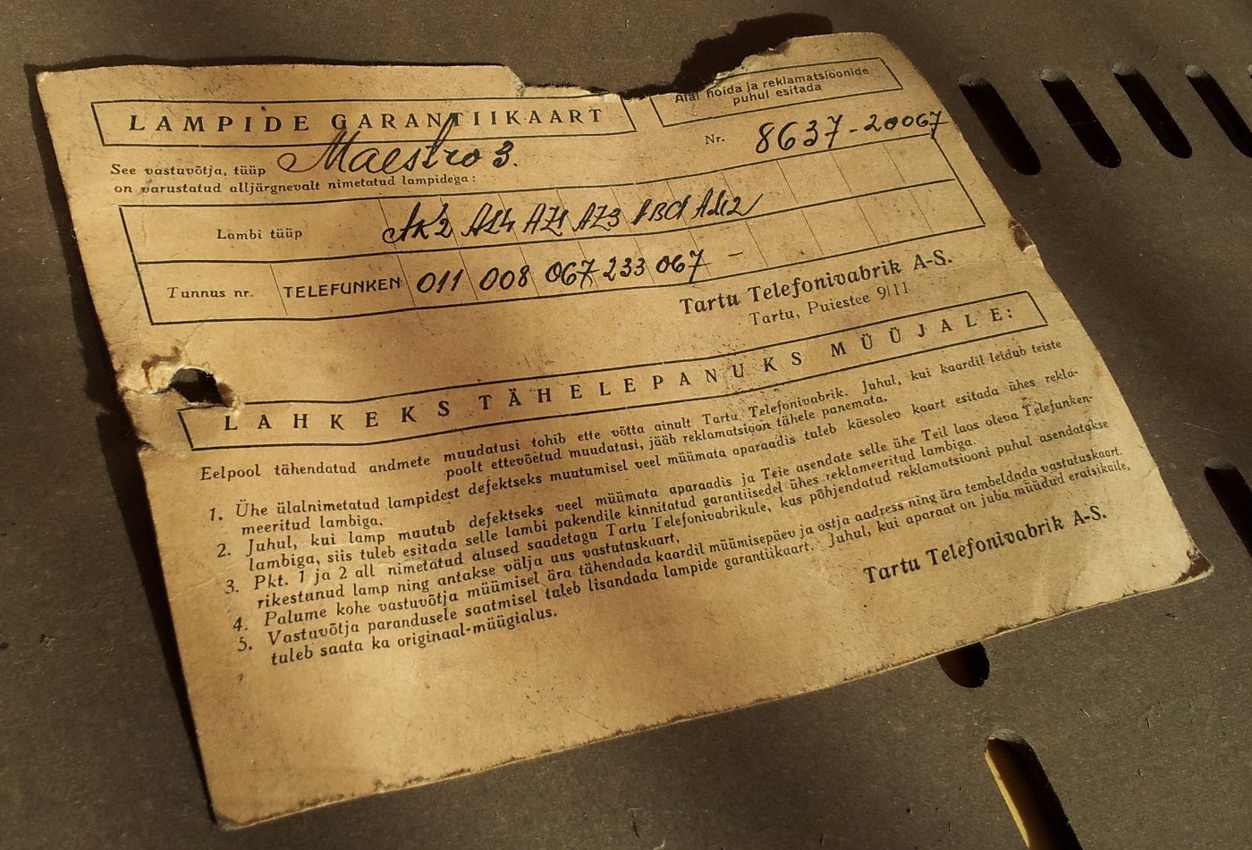 Väga haruldane on aparaadi säilinud lampide garantiikaart.