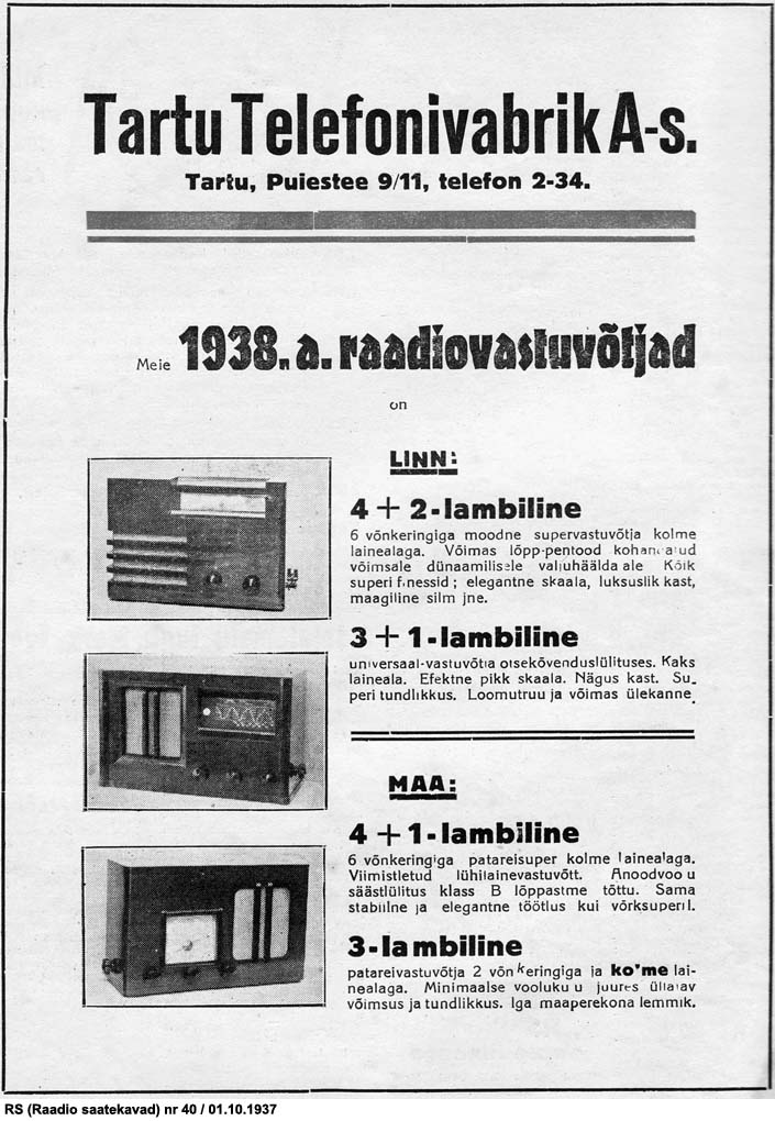 TTV mudelinimetusteta reklaam (RS Nr 40 01.10.1937) ja OÜ Esto-Muusika reklaam (Päevaleht 02.10.1937).